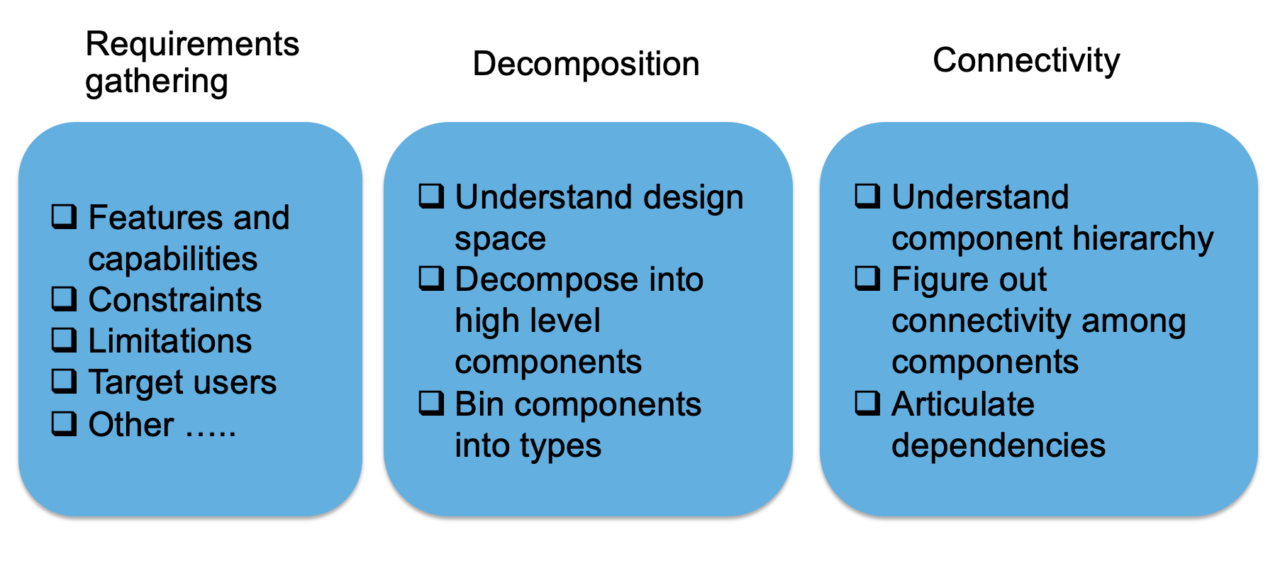 As shown in the figure above, software design has three phases: requirements gathering, decomposition, and understanding connectivity with that decomposition. These phases come one after another, though one can iterate over them as needed.